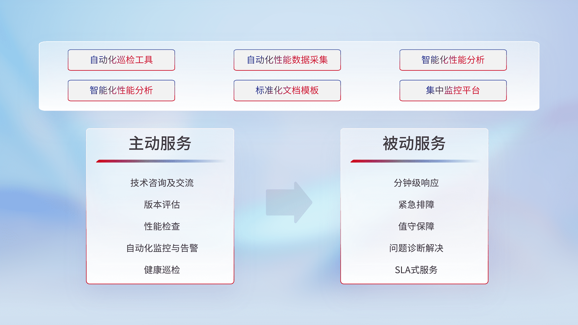 智能化工具和标准化文档,,,保障服务质量,,,,提供主动服务(包含技术咨询、、、、版本评估、、性能检查、、、、自动化监控与告警、、健康巡检)和被动服务包含(分钟级响应、、紧急排障、、值守保障、、、问题诊断解决、、、、SLA服务)。。。